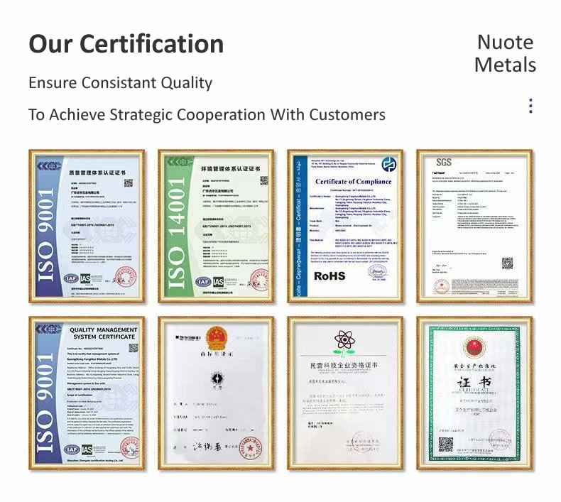 Nuote Metals provides a compliance package for every shipment of 3mm brass eyelets, including the MTC, RoHS test report (updated annually), and a signed Certificate of Conformance.