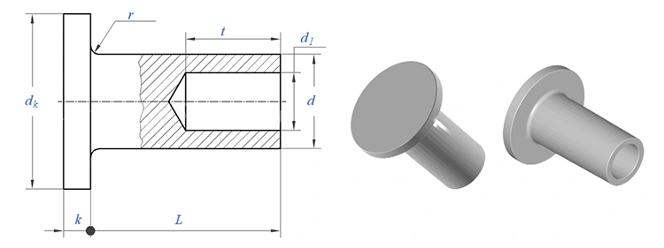 The riveting process of half hollow rivets relies on mechanical force to expand and deform the end of the shank, forming a "mushroom head" structure that locks the connected parts. The manufacturing process typically includes cold heading, drilling, and cutting. The typical materials used are including mild steel, aluminum alloy, or stainless steel. Surface treatments include galvanizing, nickel plating, and passivation to enhance corrosion resistance. For example, half hollow rivets with white zinc coating can remain rust-free for over six months in humid environments, while passivation treatment can extend this to one year.