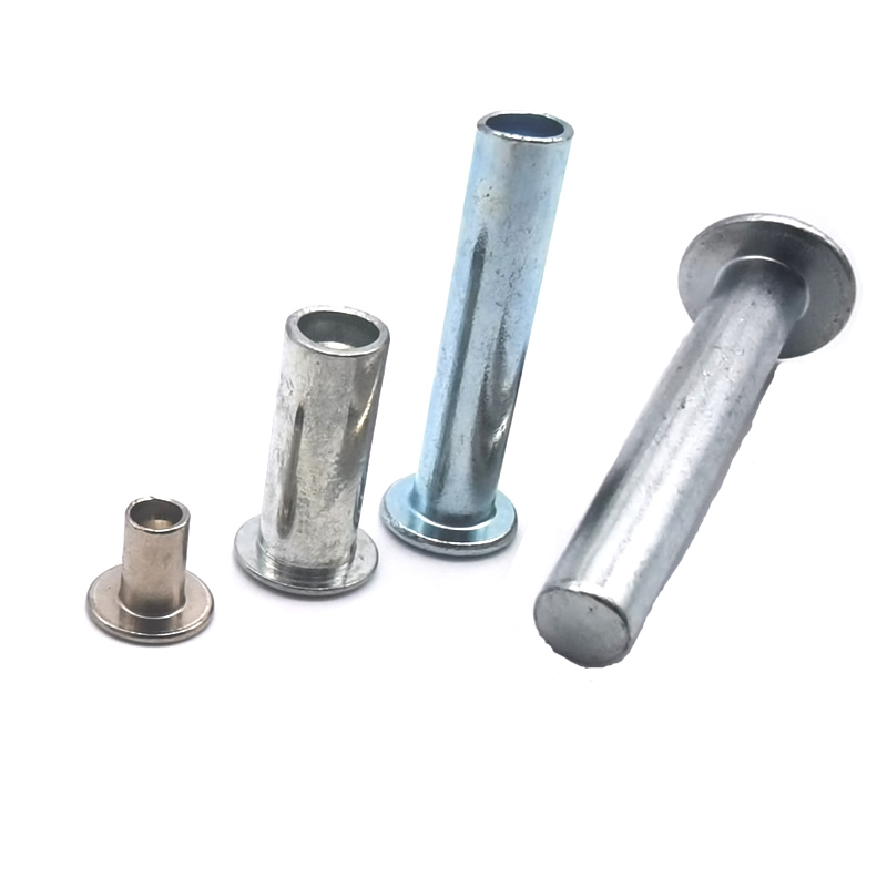 A steel flat head rivet has a wide, flat top with a conical underside. It sits tight against the surface and provides strong clamping force, making it useful in machinery frames, truck beds, structural steel, rail components, and heavy equipment. The flat head keeps things smooth where a dome might interfere.